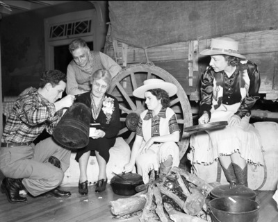 Ranch party River Crest Club for debutantes given by Mrs. W.D. Reynolds and Mr. and Mrs. R.E. Harding; from left, Dick Taylor, pouring cup of java, Mrs. W.D. Reynolds, Miss Harding, Mrs. Harding, and Mr. Harding (leaning on wagon wheel), 02/05/1938