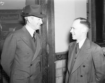 Texas Baseball League meeting; from left, Bob Tarleton, business manager of the Dallas baseball club, and Edgar G. Brands of St. Louis, sports editor and columnist for the Sporting News, 02/05/1938