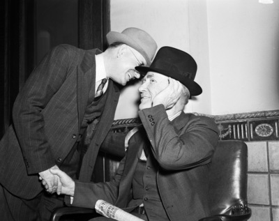 Texas Baseball League meeting; from left, Fred Ankenman, president of the Houston Baseball Club, greets Roy Largent of McKinney, veteran talent scout for the Chicago White Sox, 02/05/1938