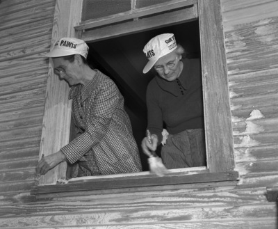Women painting Everman Methodist Church; Mrs. C.M. Langley (left) and Mrs. A.E. Thomas, 02/07/1938
