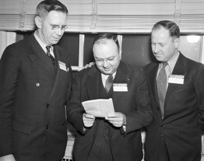 Texas Cream Improvement Association convention at Hotel Texas; from left, A&M Prof. Charles N. Shepardson, Texas Tech College Prof. K.M. Renner, and Roy Davis, 02/08/1938