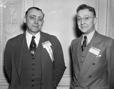 Texas Cream Improvement Association meeting; Henry Teubel, left, of Tulia elected President and Grant Johnson of Fort Worth chosen director, 02/08/1938