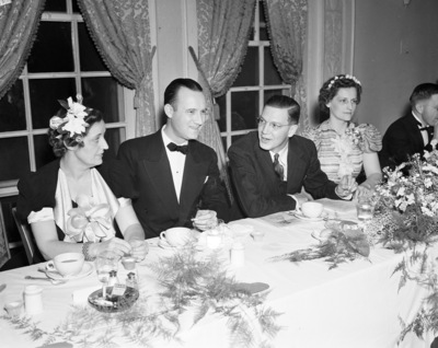 Tuxedoes; Corsages; Dresses; Fort Worth Advertising Club; Dining Tables; Cigarettes; Glassware; Draperies; Windows; Fort Worth Advertising Club; Hotel Texas (Fort Worth, Tex.); Spence, C. B. (Mrs.); Murphy, Mike (Mrs.); Murphy, Mike; Banquets; Spence, C. B.