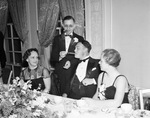 Attendees at the Fort Worth Advertising Club's annual gridiron banquet at the Hotel Texas include (from left) Mrs. DeWitt Morgan and President Morgan, and Mr. and Mrs. Robert Dundas of Houston, Texas. The couples are seated at a banquet table which is decorated with a large bouquet of flowers. Both of the mean are wearing tuxedos while the women are wearing evening gowns. Mr. Morgan is lighting a cigar for Mr. Dundas. Behind the couples are large windows with draperies.