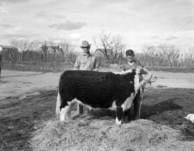 Albany Beef Show and Sale; Guy Caldwell and Will Magee with calf that took first prize for senior calves, 02/14/1938