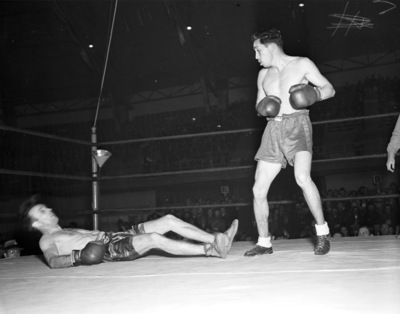 State competition Golden Gloves in Fort Worth, Fernando Vargas of Austin floors E. L. Shuman of Fort Worth in featherweight bout, 02/17/1938