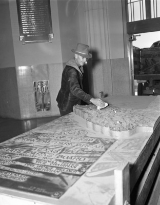 James Chester Dalgarn, engineer for the Texas State Park Board, inspects a relief map to be exhibited in an automobile show at Will Rogers Coliseum. The large map has been off-loaded from the back of a truck, partially visible via an open door. Mr. Dalgarn is using a cloth to wipe the map. He is wearing a hat and a heavy coat.