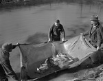 United States Federal Fish Hatchery at Lake Worth; three men moving fish, from left, George Dueser, Thad Kirby and Tobe Morris, 02/23/1938.