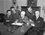 Fort Worth Rotary Club's silver anniversary celebrants included (from left) J. Edd McLaughlin (head of the Ralls, Texas Rotary Club), Clayton T. Rand, A.L. Shuman, Lewis D. Fox, and Harry W. Stanley. The men, all dressed in suits, are gathered around the end of a conference table and are reviewing Rotary Club publications. On the wall behind them is a framed picture of George Washington a set of electrical sconces and a book case.