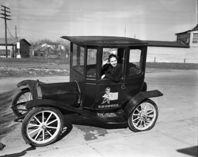 Mary Owens Campbell in old model Hupmobile coupe owned by her father, B.W. Owens, which will be an entry in "the old car contest" at the Spring Automobile Show, Will Rogers Coliseum, 02/25/1938