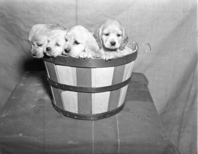 Four cocker spaniel puppies in a basket, owned by Fred Grant, 02/26/1938