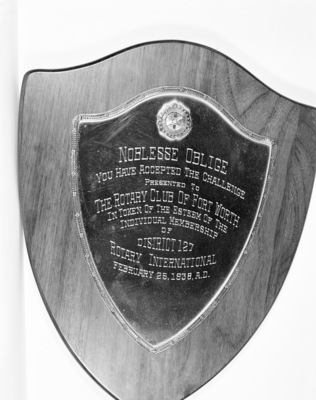 Rotary Club plaque given to Fort Worth Rotary Club president Al Shuman, 02/26/1938