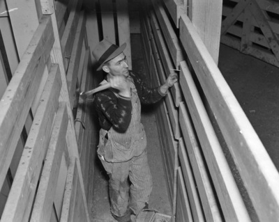 Workmen get rodeo arena at North Side Coliseum and exhibit buildings ready for the Fort Worth Southwestern Exposition and Fat Stock Show; S.T. Castleberry works on chutes, 02/26/1938