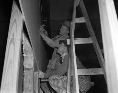 Workmen get rodeo arena at North Side Coliseum and exhibit buildings ready for the Fort Worth Southwestern Exposition and Fat Stock Show; J.M. Morgan hammers and H.N. Speer works on booth, 02/26/1938