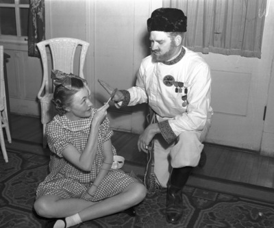 Mrs. Harry Brants offering lollipop to Mr. Harry Brants, March 1938 at Mardi Gras Ball at River Crest Country Club