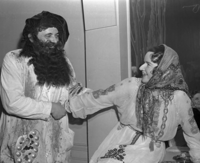 Clinton King with flowing beard and Evelyn Smith in peasant costume, at Mardi Gras Ball at River Crest Country Club, 03/1938.
