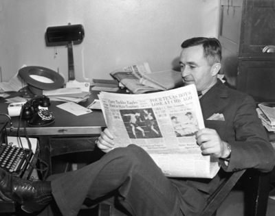 Blair Cherry, University of Texas coaching faculty, reads Fort Worth Star-Telegram, 03/01/1938