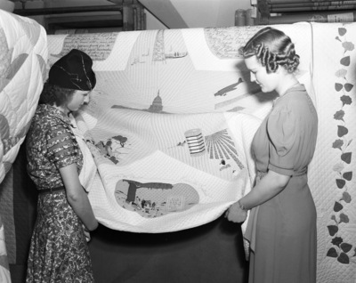 Star-Telegram and Leonard Brothers Quilt Show; quilt has state capitol, oil wells, cotton bales, cowboys and other Texas symbols, made by Lydia Hohenstein of Henrietta; from left, Georgia Clevenger and Mrs. J.E. Sawyer, 03/1938