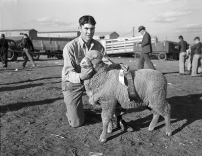Nolan-Fisher Boys Club Show at Sweetwater; Thomas Kinerd, Divide vocational student and his first prize fine wool mutton lamb bred by W.L. Boothe, Sweetwater, 03/02/1938