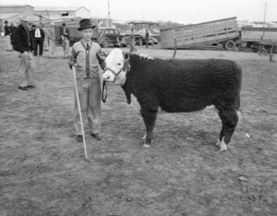 Nolan-Fisher Boys Club Show at Sweetwater; Kenneth Lewis and his first prize milk-fed calf in weighty class that was grand champion baby beef of the show, 03/02/1938