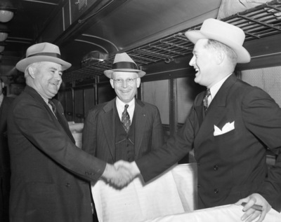 Fort Worth's Southwestern Exposition and Fat Stock Show boosters leaving for South Texas; from left, Homer Covey, E.C. Jordan, and George W. Putnam, 03/02/1938