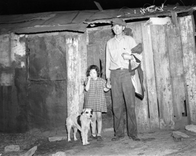 Fire destroyed two-room house at 908 Congress Street; surveying damage are 7-year-old Libby Joe Wallace and dog Blackie with grandfather J. L. Miller, 03/03/1938