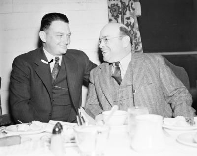 Farewell banquet at Blackstone Hotel for Armour cattle buyer Mod R. Overton after 23 years at Armour & Co.; with George Scaling, right, Overton's boss, 03/03/1938