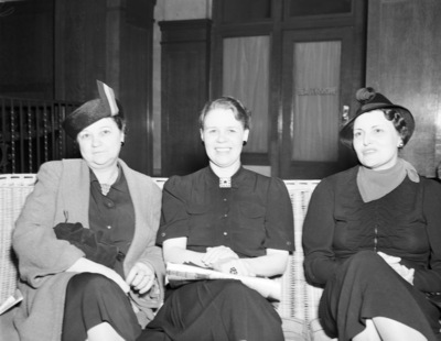 John Stribling Auction and Sweetwater Hereford Auction; from left, wives of prominent stockmen, Mrs. Millard Eitson (Lovington, NM), Mrs. W. A. McSpadden (Amarillo), and Mrs. John Stribling (Rotan), 03/03/1938.