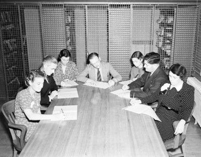 Seven candidates seeking scholarships to Teachers College, Columbia University, take tests; from left, Marry E. Standefer, Ben Copass, Ruth Lowes, C. W. Waller, Mary L. Doggett, George H. Gentry, and Irene Aby, 03/04/1938