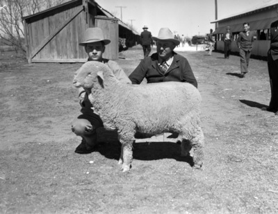 San Angelo Fat Stock Show and Rodeo; Gerlad Nicks (Eldorado) with grand champion fine wool lamb, and Jess Koy (Eldorado), breeder of the lamb, 03/05/1938