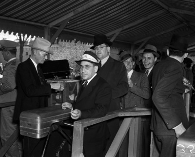 Electra delegation at Fort Worth's Southwestern Exposition and Fat Stock Show; entering the gates are Albert Zeff (in front) and T. Leo Moore, representatives from the Electra Chamber of Commerce, 03/08/1938