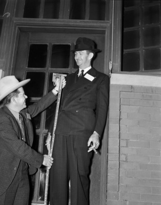 Fort Worth Southwestern Exposition and Fat Stock Show's Round-up Club booster trip to West Texas by bus; Joe Mulholland Junior (left) measures J. Tom Miller who is over six feet tall, 03/08/1938