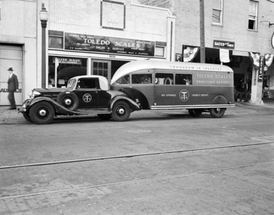 Toledo Scales Precision Devices storefront and car with trailer on street in front, 03/15/1938