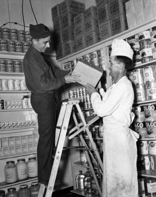 Veteran C.C.C. camp (Civilian Conservation Corps.), Denton, Texas, men not identified who are stocking groceries on shelves, 03/14/1938.