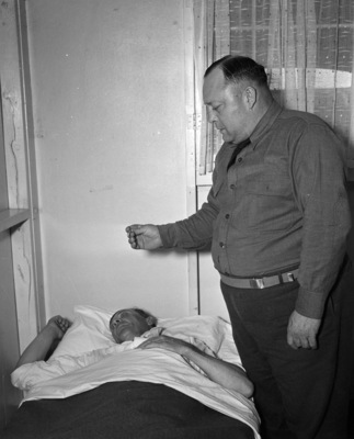 Veteran C.C.C. camp (Civilian Conservation Corps.), Denton, Texas, man sick in bed with fellow corpsman tending him (neither are identified), 03/14/1938.