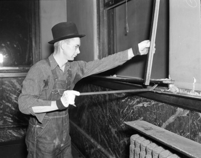 Demolition of the old Carnegie Public Library; Raymond Price rips off window sill in the reading room, 03/22/1938