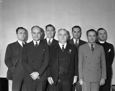 Newly elected Fort Worth Optimist Club officers; from left, back, J. Warren Day, Truett Mann, Floyd Shelton, Rev. Sherwood Clayton; front, Earl Lingo, H.C. Calhoun, Norman Haley, 04/1938