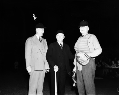 Season opener baseball game between Fort Worth Cats and the Dallas Steers; Amon Carter pitched to batter Stanley Thompson, center, Cats' president and Dr. Webb Walker was catcher, 04/13/1938