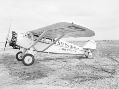 Ritchey Flying Service plane, Edwin Ritchey pilot, displaying Star-Telegram sign; plane used to take aerial views around Texas.