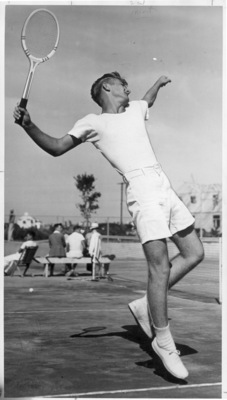 High school state tennis champion Bobby Curtis ready to smash volley in State Junior tennis championship at Colonial Country club, June 9, 1938