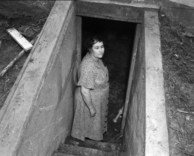 Unidentified woman stands in doorway to tornado shelter following tornado that hit Clyde, Texas, 06/12/1938