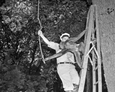 Forest Park Zoo keeper Jim Brown tries to lower the escaped Gibbie, a full-grown Gibbon ape, to the ground with a pole after he escaped his cage, 06/20/1938