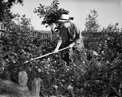 Fort Worth Fire Chief, S. Ferguson, works at his favorite hobby, a flower and rock garden. This photo was taken at his home on Grand Avenue. 06/19/1938