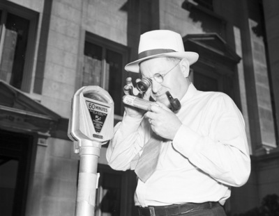 C.H. Montgomery of Fort Worth Police Department inspects coin tube of parking meter, nine of which were robbed, 06/20/1938