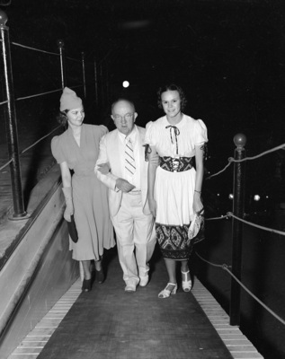 New Show Boat nightclub, Northwest Highway at Lake Worth; coming up the gangplank are William Monnig with Miss Kathryn Wandry (left) on one arm and Miss Billie Grimes on the other, 06/30/1938.
