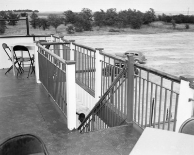 Brass railing across upper deck of Bob Carnahan's new Show Boat nightclub at Lake Worth and the steel stairway leading to it were originally in the old Carnegie Public Library at 9th and Throckmorton, 06/30/1938