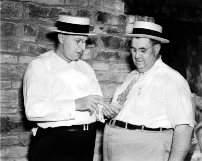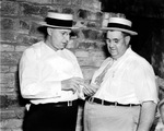 Catholics celebrate 4th of July with picnic at Lake Worth; from left, Reverand A. Schmitt, official host, talks details with S.V. Jay, chairman of committee, 07/04/1938