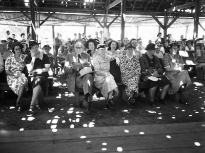 Crowd at Amon G. Carter event in Texas. People are gathered under a canopy; some are sitting on rows of benches while others are standing in the background. Amon Carter is sitting in the front row, third from left. He is reading a book.