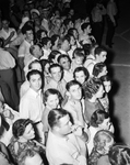 Crowds gather at Santa Fe railway depot to greet President Franklin D. Roosevelt on his third visit to Fort Worth, 07/10/1938