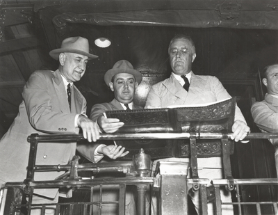 From left, Amon G. Carter, Sr., an unidentified administrative aide, and President Franklin Delano Roosevelt on the back of a railroad train. It appears Roosevelt is preparing to give a speech.